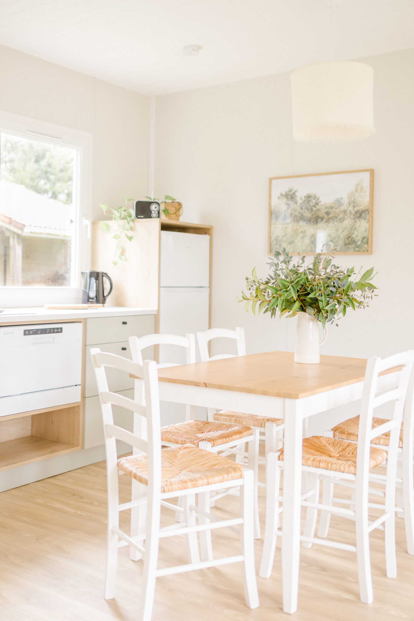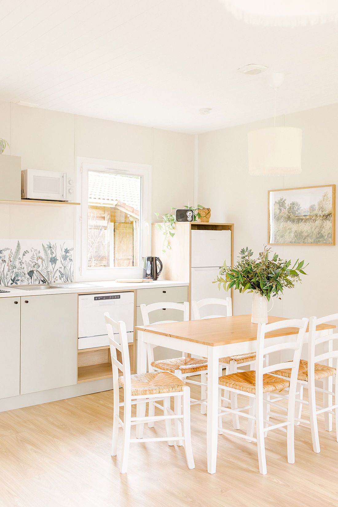 With beautiful throws and cushions in original patterns, the interior designer has given the living room’s sofa beds a whole new charm. The kitchen has been refreshed with a countryside-style backsplash design. In this combined living and dining area, you’ll find: