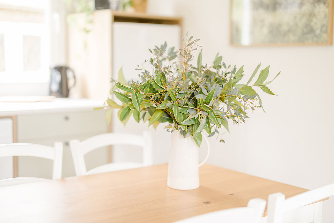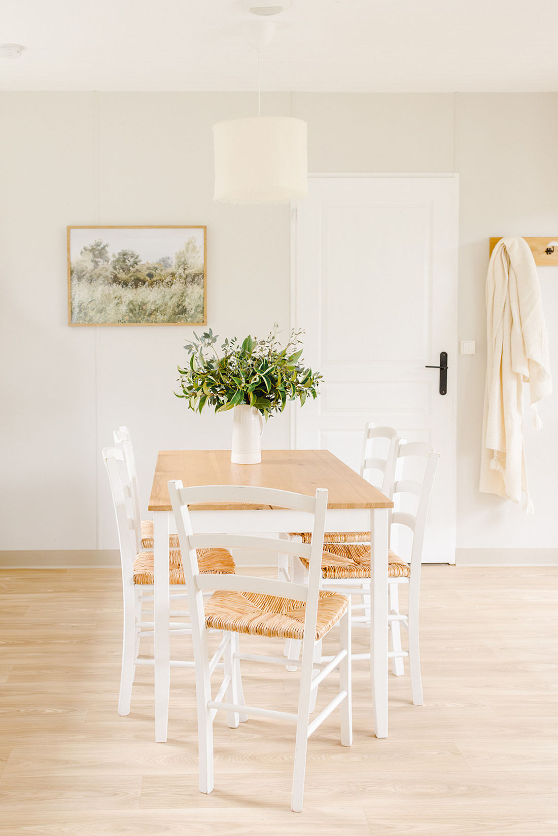 Met mooie dekens en kussens met leuke prints heeft de binnenhuisarchitect de slaapbank in de woonkamer naar een hoger niveau getild. De keuken is opgefrist met een imitatie-achterwand met een landelijk motief. U vindt in dit vertrek: