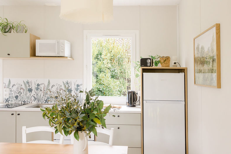 Toen we besloten te beginnen met de renovatie van onze 8 chalets van 45 m², dachten we meteen aan onze vriendin en binnenhuisarchitect Mathilde. Ze wist de warme atmosfeer van onze accommodaties te versterken door bijvoorbeeld nieuwe materialen zoals textiel te gebruiken. Een van de sterke punten van het interieur is de keuze voor zachte kleuren …