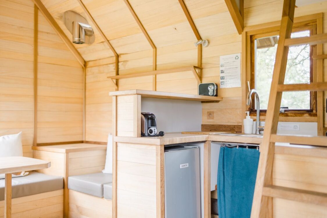 n dit houten chalet, gemaakt van hoogwaardige en ecologische materialen, verschuilt zich een knus (16 m²) en behaaglijk interieur dat geschikt is voor alle seizoenen. De leefruimte heeft uitzicht op de natuur en er hangt een rustgevende sfeer. Dit ‘tiny house’ is uitgerust met een badkamer, een keuken en 4 knusse bedden waarvan 1 tweepersoonsbed op de mezzanine. De indeling is uiterst doordacht en het afwerkingsniveau ongeëvenaard. Kies voor uw vakantie met z'n tweeën of met het gezin in de Vendée voor het Origineel huisje: het buitengewone vakantieverblijf van het landgoed.