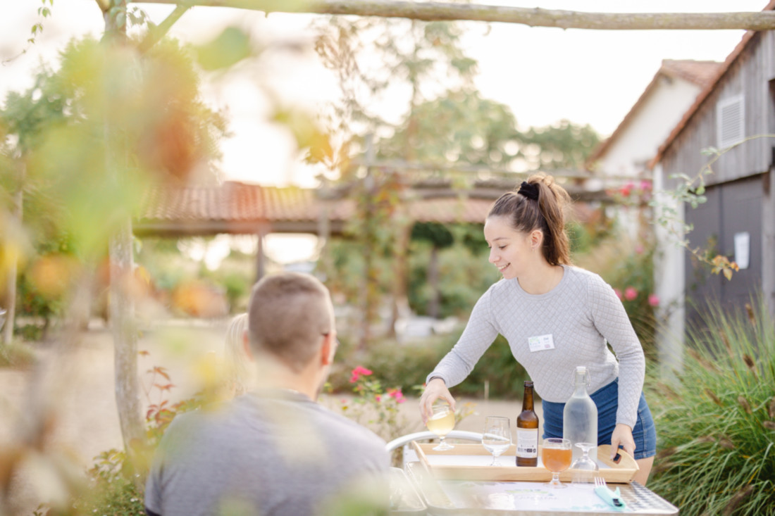 Dans ce cadre agréable, vous goûterez le soir à une vraie restauration sur réservation avec service à table et des plats composés de produits frais et locaux. Bien mieux que du snacking ! Les légumes et fruits frais comme la laitue, les tomates, les courgettes proviennent de nos maraîchers bio Sandra et Mathieu Gilbert. Ils nous permettent de mijoter notre ratatouille ensoleillée, notre gratin de courgette à la menthe et nos salades fraîcheurs. La fromagerie “La Ferme les Alpines” nous approvisionne en bons fromages bios qui viendront garnir nos assiettes. L’Épi Sucré des Brouzils nous livre chaque jour le pain frais et les desserts pâtissiers à déguster à table.